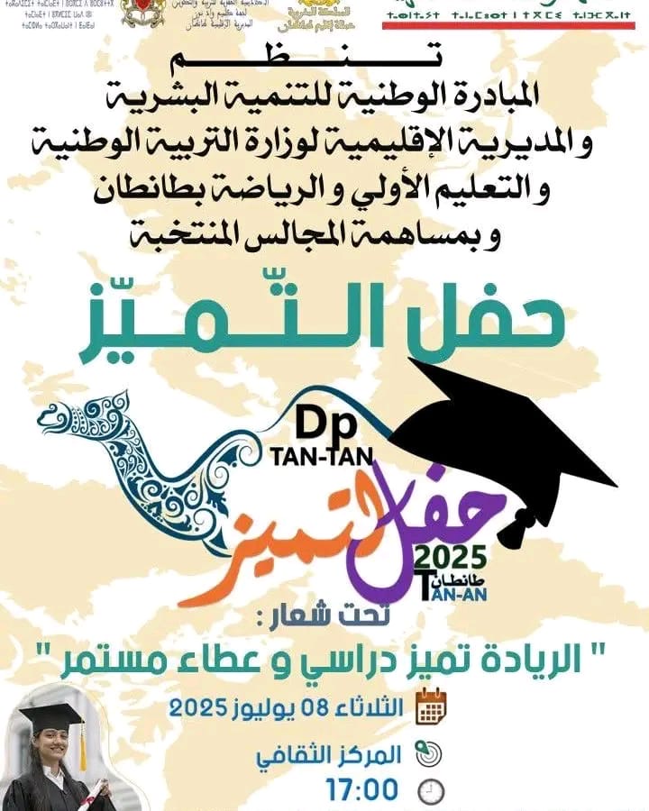 تنظم المبادرة الوطنية للتنمية البشرية بشراكة مع المديرية الإقليمية لوزارة التربية الوطنية والتعليم الأولي والرياضة بطانطان، حفل التميز يوم الثلاثاء 8 يوليوز 2025، وذلك بالمركز الثقافي للمدينة.