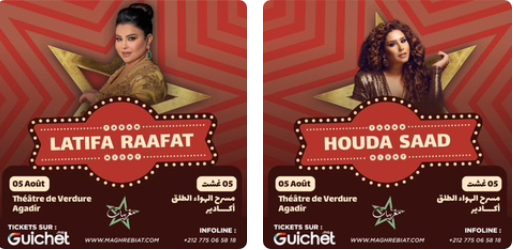 في إطار برنامجها الفني والثقافي لصيف 2025، تطلق تظاهرة “مغربيات” دورتها الأولى بمدينة أكادير، من خلال تنظيم سهرة طربية نسائية كبرى تجمع لأول مرة على منصة واحدة اثنتين من أيقونات الغناء المغربي: لطيفة رأفت وهدى سعد، وذلك مساء يوم الثلاثاء 5 غشت 2025 بمسرح الهواء الطلق.