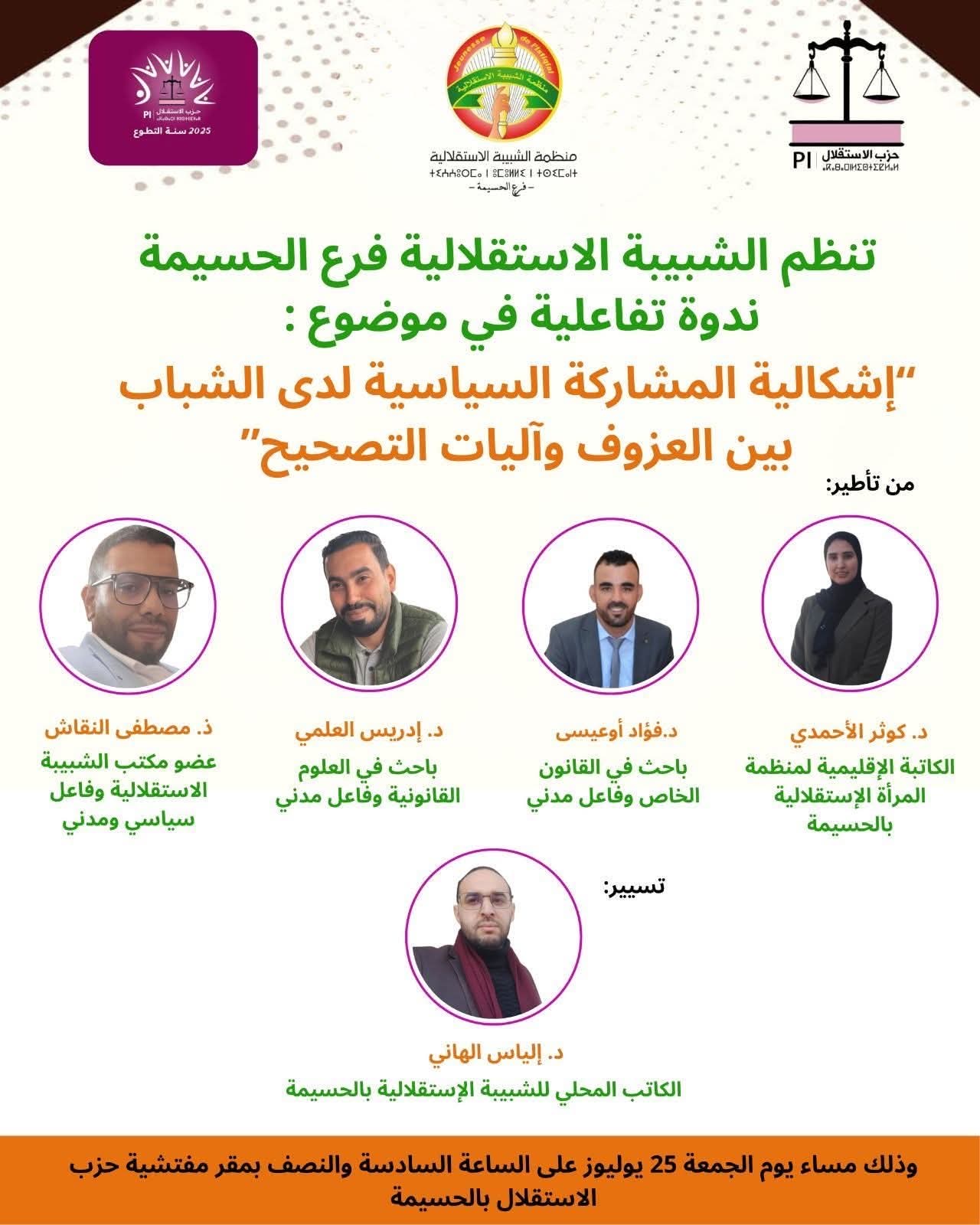 الندوة التي تنظمها الشبيبة الاستقلالية – فرع الحسيمة، تنفتح على مقاربة تشاركية وتعددية في تأطير النقاش، بمشاركة نخبة من الباحثين والفاعلين السياسيين والمدنيين، وذلك بهدف تشخيص واقع المشاركة السياسية للشباب، واستكشاف إمكانيات إحياء روح الانخراط والمبادرة داخل الفضاء العمومي.