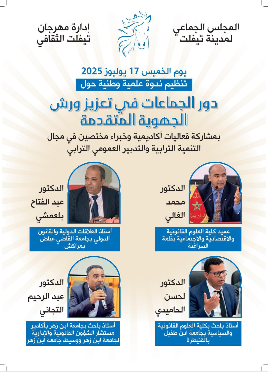 احتضنت مدينة تيفلت، يوم الخميس 17 يوليوز 2025، ندوة وطنية علمية حول موضوع “دور الجماعات في تعزيز ورش الجهوية المتقدمة بالمغرب”، وذلك في إطار فعاليات مهرجان تيفلت المنظم هذه السنة تحت شعار “دور الثقافة في ترسيخ الهوية المغربية لخدمة الوحدة الوطنية”. وجاء تنظيم هذه الندوة من طرف جماعة تيفلت بشراكة مع إدارة المهرجان، في سياق الانخراط الفعلي في النقاش الوطني المرتبط بتجويد الفعل العمومي الترابي وتفعيل ورش الجهوية المتقدمة.