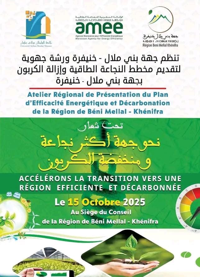 في إطار التوجه الوطني الرامي إلى تعزيز التحول نحو الطاقات النظيفة وتحقيق التنمية المستدامة، ستحتضن جهة بني ملال–خنيفرة يوم 15 أكتوبر 2025 بمقر مجلس الجهة، ورشة جهوية حول مخطط النجاعة الطاقية والتحول نحو اقتصاد أخضر، وذلك بشراكة مع الوكالة المغربية للنجاعة الطاقية (AMEE) وجامعة السلطان مولاي سليمان.