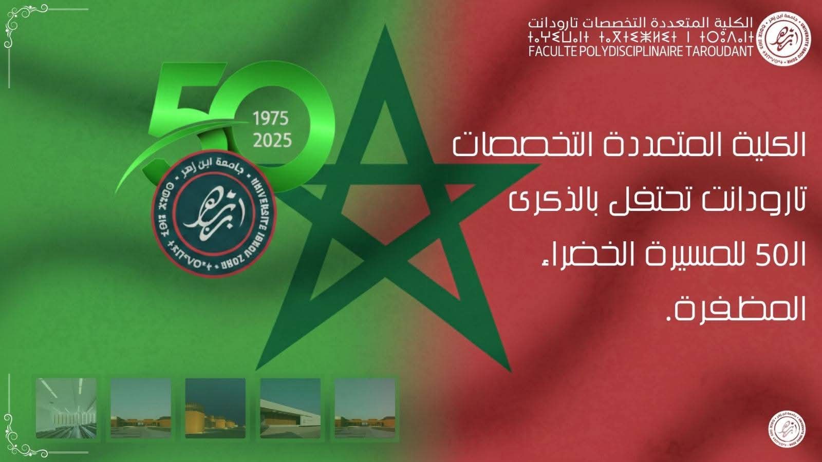 في أجواء يملؤها الاعتزاز والفخر، تحتفي الكلية متعددة التخصصات بتارودانت، التابعة لجامعة ابن زهر بأكادير، بالذكرى الخمسين للمسيرة الخضراء المظفرة، هذه الملحمة الوطنية الخالدة التي جسدت أسمى معاني الوحدة والتلاحم بين العرش والشعب.