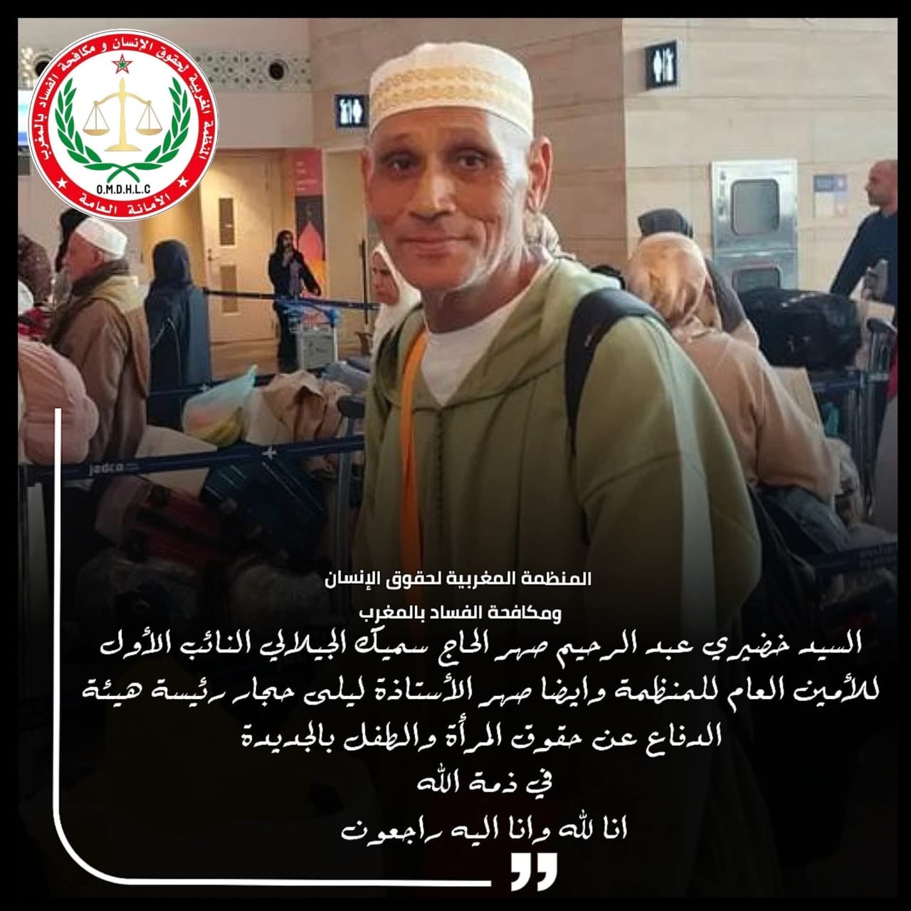 وبهذه المناسبة الأليمة يتقدم السيد عبد الرحمن خنوس الأمين العام للمنظمة المغربية لحقوق الإنسان ومكافحة الفساد بالمغرب، أصالة عن نفسه ونيابة عن كافة أعضاء المكتب التنفيذي ورؤساء المكاتب الجهوية والإقليمية والمحلية وكذا المنسقين والمنتدبين داخل الوطن وخارجه بأصدق مشاعر التعزية والمواساة إلى أسرة الفقيد الكريمة راجين من المولى عز وجل أن يتغمده بواسع رحمته ويسكنه فسيح جناته ويجعل قبره روضة من رياض الجنة وأن يلهم أهله وذويه جميل الصبر وحسن العزاء.