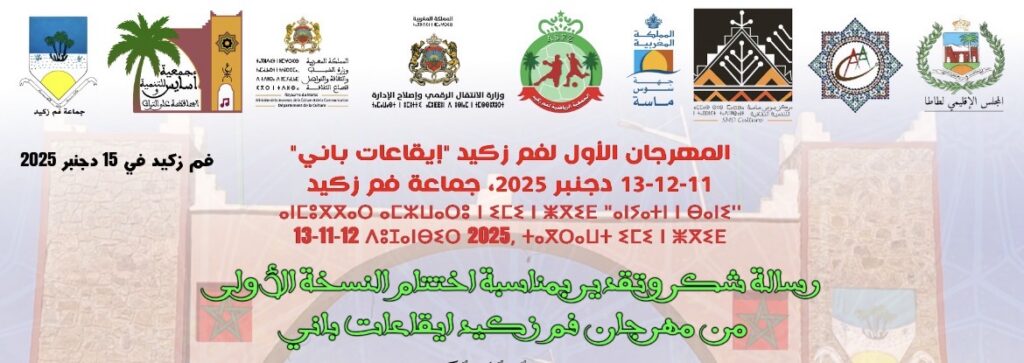 أسدل الستار، يوم الأحد 15 دجنبر 2025، على فعاليات المهرجان الأول لفم زكيد “إيقاعات باني”، المنظم خلال الفترة الممتدة من 11 إلى 13 دجنبر 2025، بجماعة فم زكيد، في أجواء احتفالية مميزة، عكست نجاح هذه التظاهرة الثقافية في نسختها الأولى، وما حملته من رسائل ثقافية وتنموية عميقة.