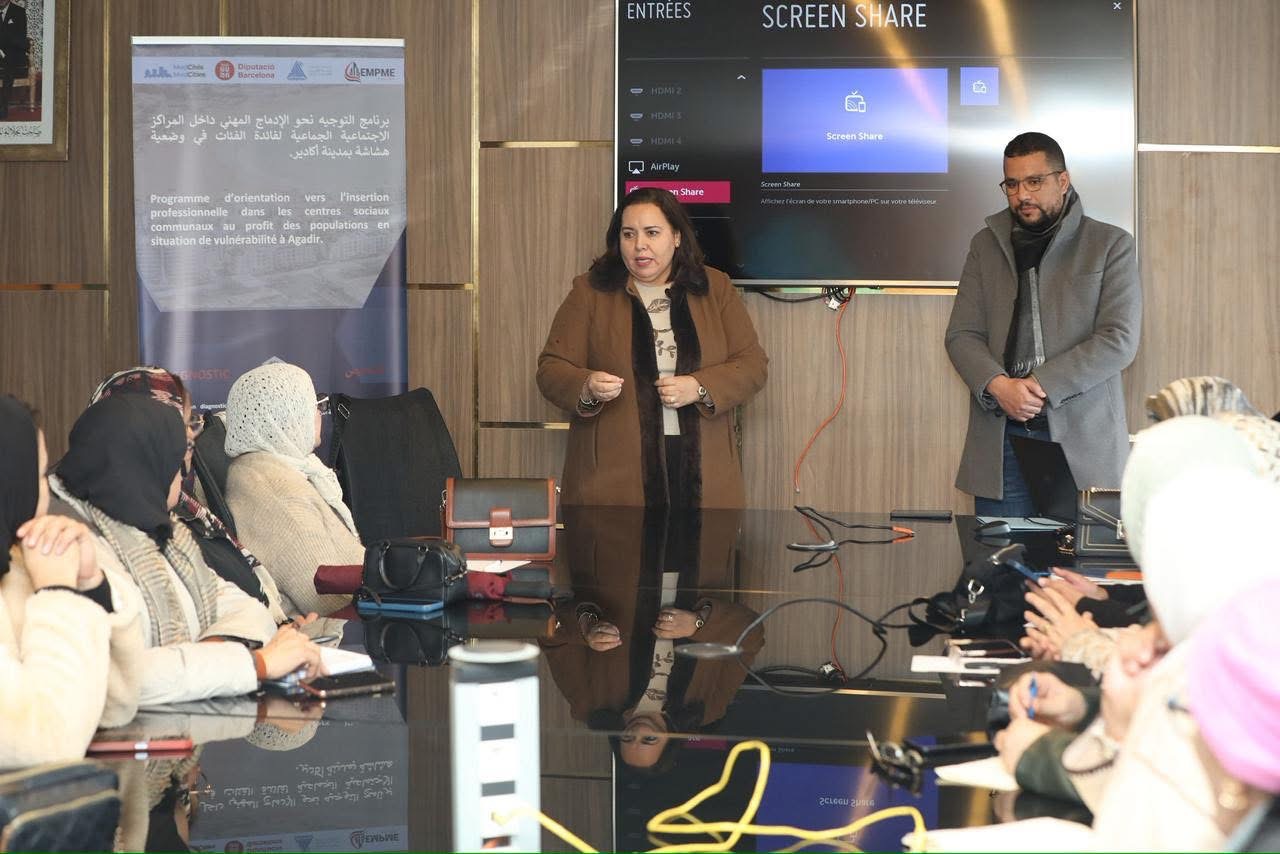 في إطار تعزيز الإدماج المهني والاقتصادي للفئات في وضعية هشاشة، نفّذت الجماعة الترابية لأكادير، خلال مدة شهرين، مشروعا يهم التوجيه نحو الإدماج المهني داخل المراكز الاجتماعية الجماعية، لفائدة الساكنة المستفيدة من خدمات هذه المراكز.