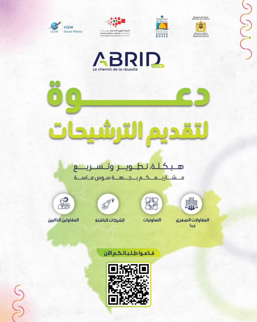 أعلن المركز الجهوي للاستثمار لسوس ماسة، بشراكة مع ولاية جهة سوس ماسة، ومجلس الجهة، والاتحاد العام لمقاولات المغرب – سوس ماسة، عن الإطلاق الرسمي لبرنامج «ABRID Accélération»، وهو برنامج طموح يهدف إلى مواكبة وتسريع نمو 100 مقاولة تنشط بمختلف عمالات وأقاليم الجهة.