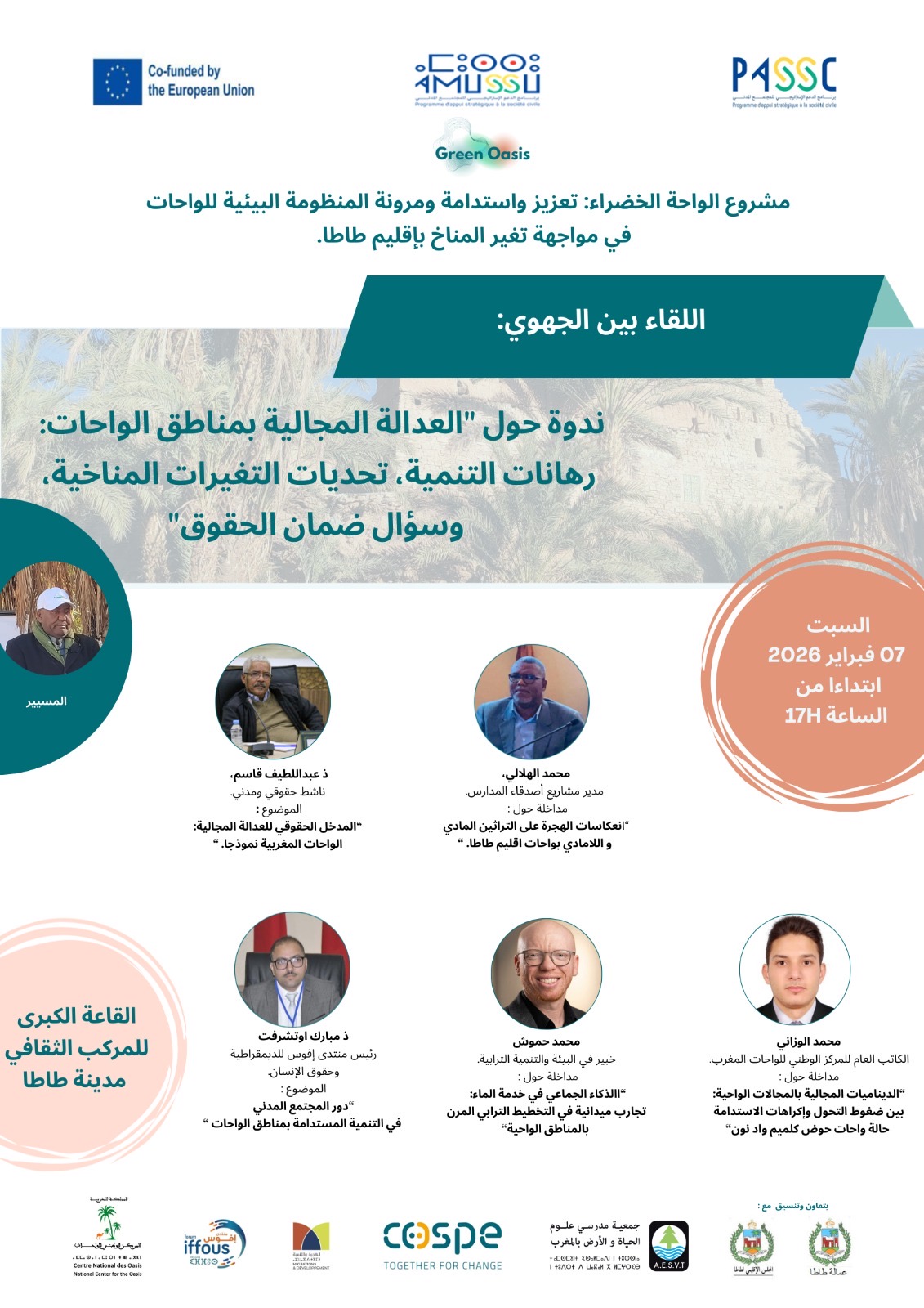 تحتضن مدينة طاطا، يوم السبت 07 فبراير 2026، لقاء جهويا هاما حول موضوع العدالة المجالية بمناطق الواحات: رهانات التنمية، تحديات التغيرات المناخية، وسؤال ضمان الحقوق، بمشاركة باحثين وأكاديميين وفاعلين مؤسساتيين وممثلي المجتمع المدني، إلى جانب مهتمين بقضايا التنمية المستدامة وحقوق الإنسان بالمجالات الواحية.