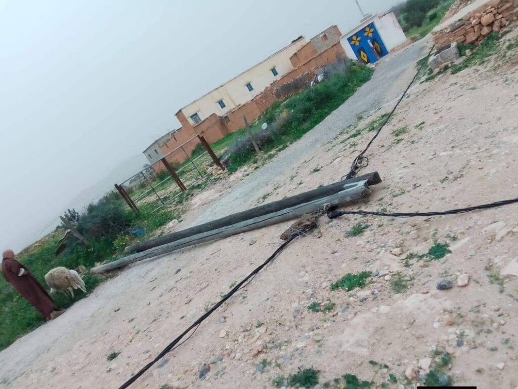 يشهد دوار تلكردوست، التابع لجماعة تسكدلت بإقليم اشتوكة آيت باها ، وضعا خطيرا عقب الرياح القوية التي ضربت المنطقة خلال الأيام الأخيرة، متسببة في سقوط عدد من الأعمدة الكهربائية وتدلي أسلاك مشحونة بالتيار في أماكن متفرقة من الدوار.