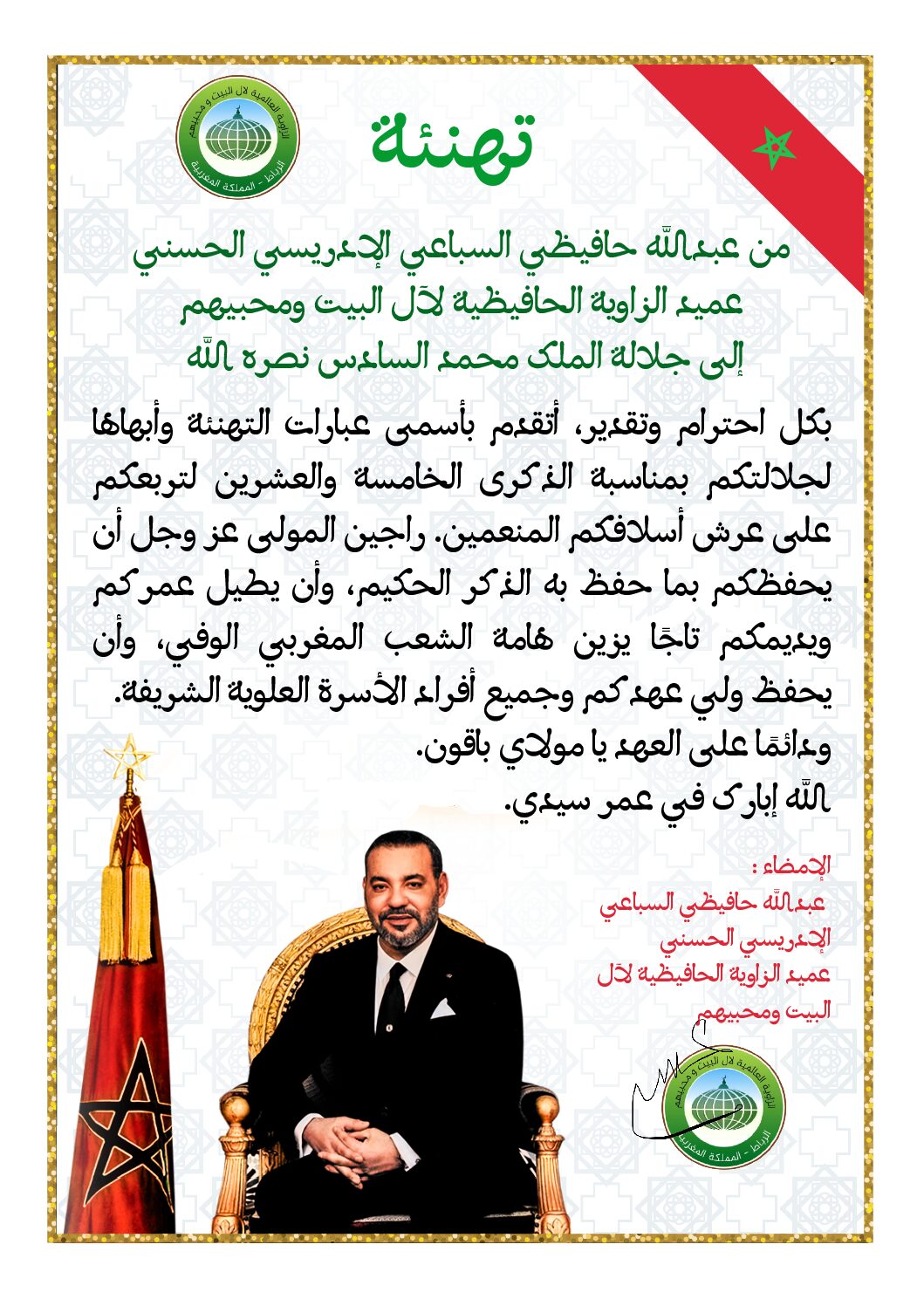 الزاوية العالمية ل أل البيت تهنئ جلالة الملك بمناسبة عيد العرش المجيد